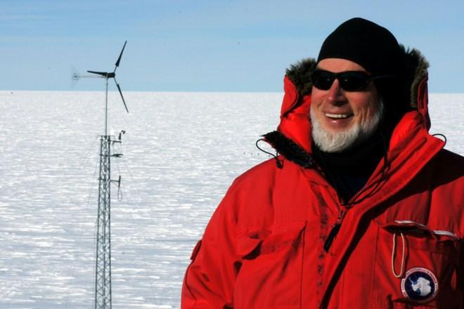 The station shown at the upper left has a small wind turbine for year round power generation, and a 320W photovoltaic panel for generation during the austral summer.