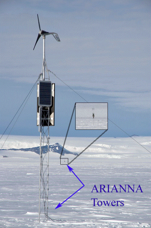 The IDL is responsible for re-building ARIANNA turbines for the cold environment on the Ross Ice Shelf, Antarctica. Two such turbines, together with PV panels, are shown in the field.