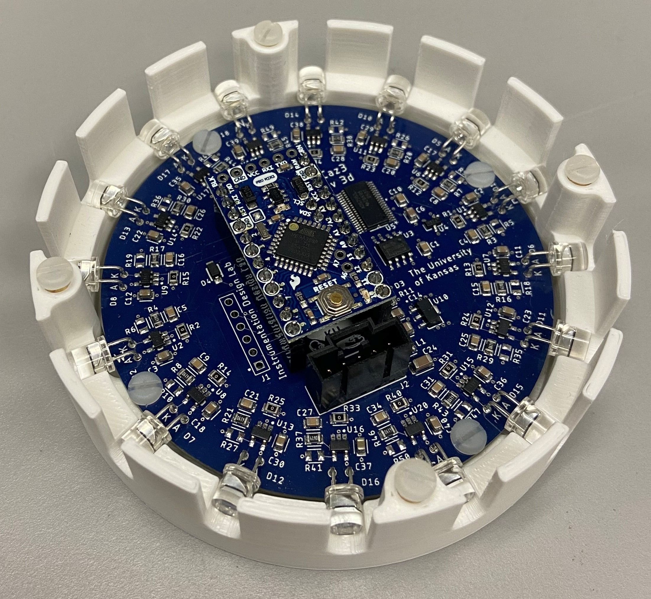Hicaz uses 16 light sensors each separated by 22.5 degrees in a circular pattern to determine Hical3's orientation with respect to the sun. The light sensors are exposed to the sun via small apertures inside a white cylindrical case. Calibrated by an in lab light source, Hicaz's angular calculation has been shown to accurately predict its orientation with respect to the sun within 2.5 degrees at ground level in Lawrence.