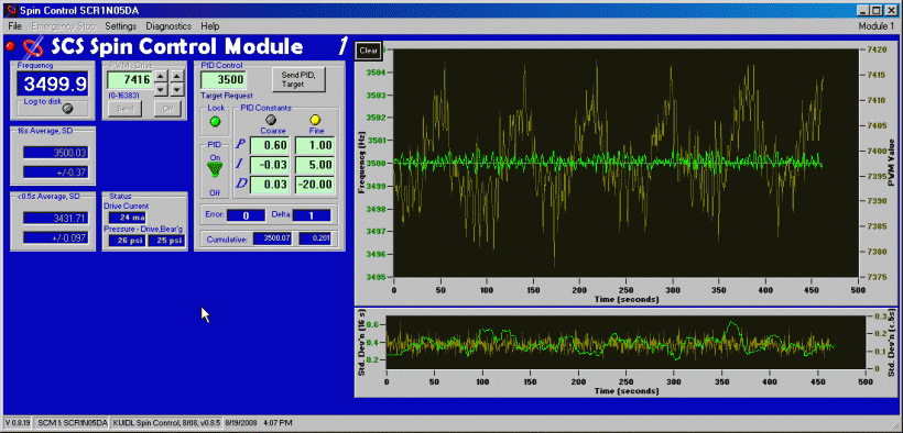 The controller measures the rotational rate of the NMR sample twice per second to a precision below 0.1Hz, and then uses a PID algorithm to keep that rate constant indefinitely.
