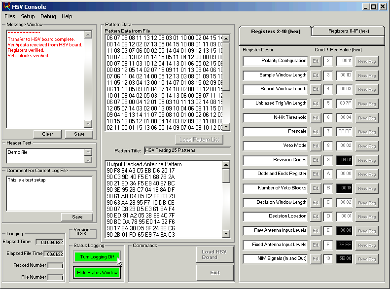 The GUI presents an array of statistics, updated in real time, about the experiment. It is also the route to entry of parameters including the uploading of timing patterns.