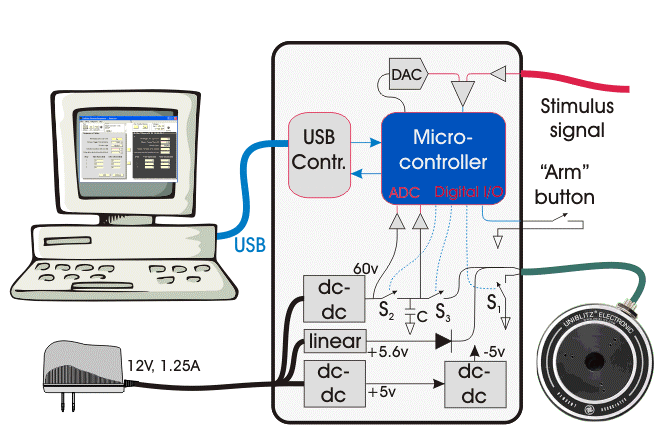 The implementation is based on a microcontroller and a DAC (digital-to-analog converter). The DAC sets the threshold for stimulus pulses, and the microcontroller times the sequences that were designed in a graphical user interface.